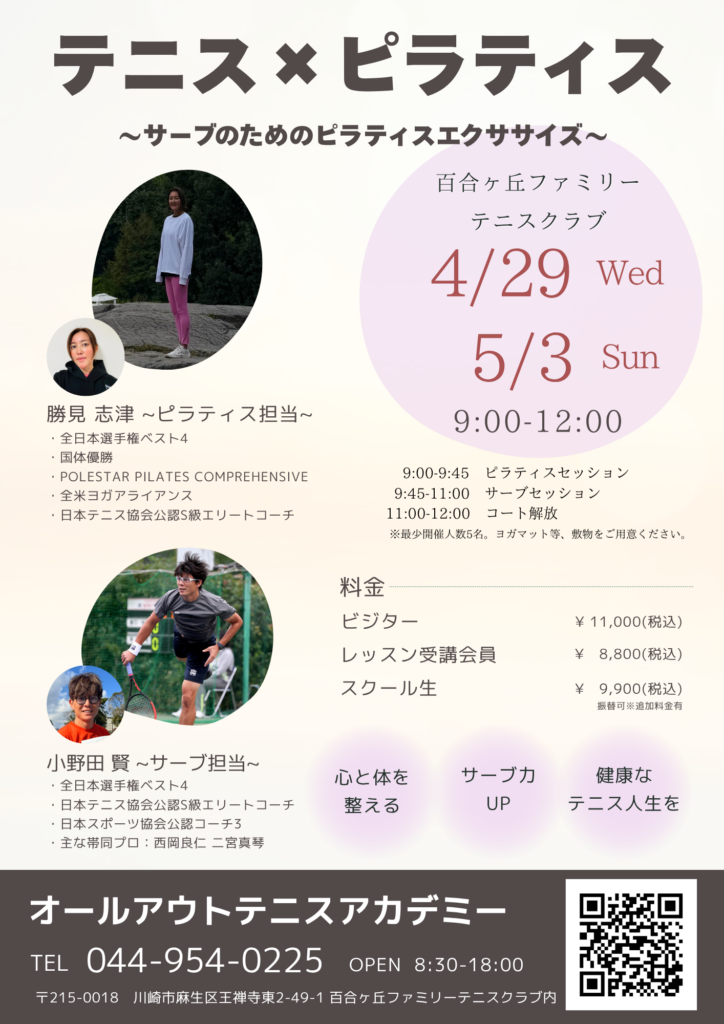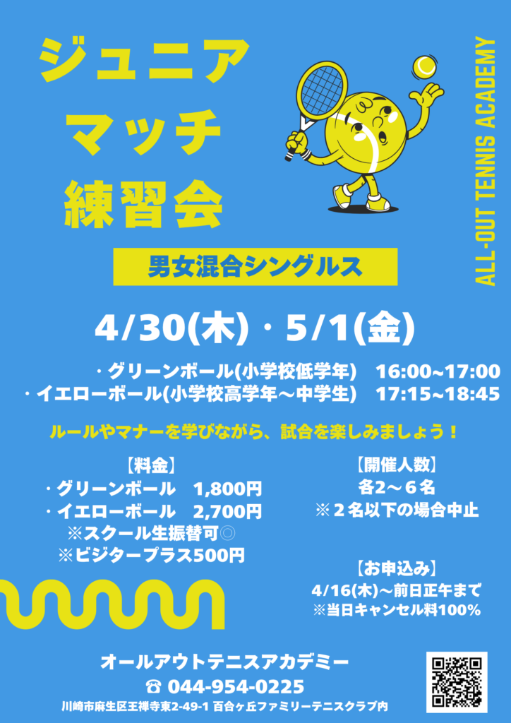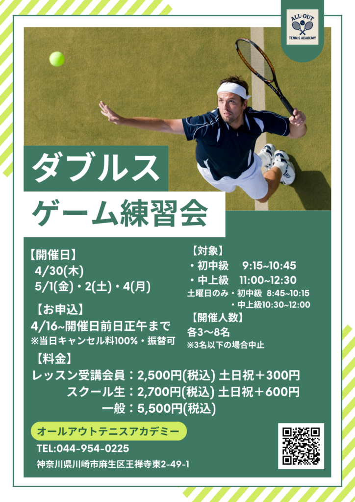 4/29(水)〜5/5(火)はスクール休業のためレギュラーレッスンは開催されませんが、様々なイベントをご用意しているので、是非テニスベアもしくはお問い合わせフォーム、お電話からお問合せください!